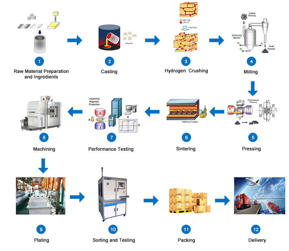 1. Designul compoziției: Designul compoziției NdFeB sinterizat este foarte important. Se referă la faptul că calitatea produsului și indicatorii de performanță magnetici pot îndeplini cerințele clienților, deoarece multe proprietăți magnetice intrinseci ale materialului, cum ar fi polarizarea magnetică, temperatura Curie etc. Este determinată de compoziția materialului. Principiul de bază al proiectării compoziției este de a asigura o performanță intrinsecă suficient de ridicată, luând în considerare în același timp costurile materialelor. (Costul materiilor prime reprezintă aproximativ 65%-90% din costul total al materialelor NdFeB sinterizate. Sub premisa îndeplinirii cerințelor de performanță magnetică ale utilizatorului, componentele ieftine ar trebui utilizate cât mai mult posibil, iar metalele pământurilor rare și alte materiale din metale prețioase ar trebui utilizate mai puțin)