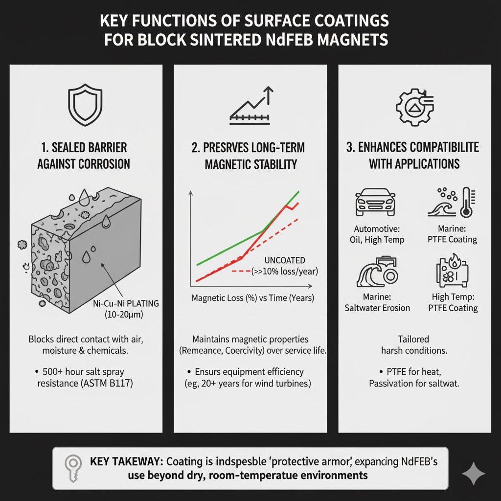 Acoperirea de suprafață acționează ca o „blimă de protecție” adaptată vulnerabilităților Block Sintered NdFeB, îndeplinind trei funcții de bază care sunt indispensabile pentru utilizarea sa practică.