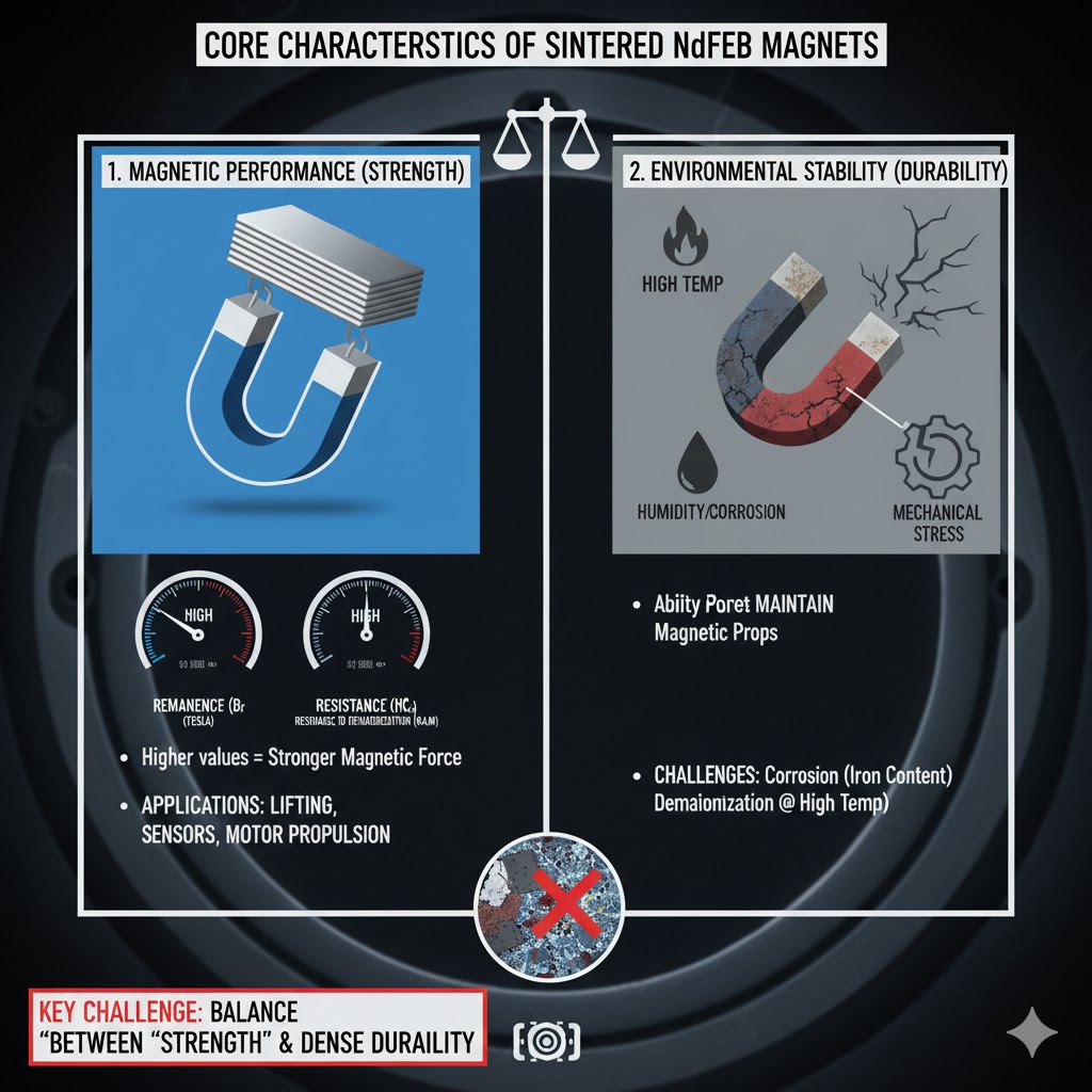Magneții NdFeB sinterizat (neodim-fier-bor) sunt printre cei mai puternici magneți permanenți disponibili, utilizați pe scară largă în industrii precum electronica, auto și energia regenerabilă. „Trăsăturile lor de bază” gravitează în jurul a două proprietăți conflictuale, dar critice: performanța magnetică și stabilitatea mediului. Performanța magnetică este definită de parametri precum remanența (Br, densitatea maximă a fluxului magnetic) și coercivitate (HcJ, rezistența la demagnetizare) - valori mai mari înseamnă forță magnetică mai puternică pentru sarcini precum ridicarea, activarea senzorului sau propulsia motorului. Stabilitatea, dimpotrivă, se referă la capacitatea magnetului de a păstra aceste proprietăți în condiții dure: temperaturi ridicate/scăzute, umiditate, coroziune sau stres mecanic. Magneții NdFeB sinterizați tradiționali sunt în mod natural predispuși la coroziune (datorită conținutului lor de fier) și își pot pierde magnetismul la temperaturi ridicate, făcând echilibrul dintre „rezistență” și „durabilitate” o provocare cheie atât pentru producători, cât și pentru utilizatori.
