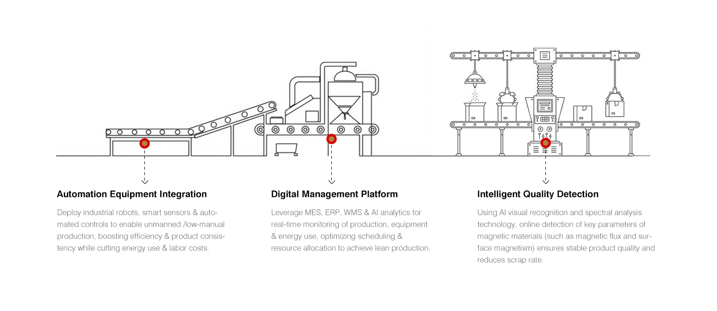 Jinlun Magnet este o întreprindere inovatoare din punct de vedere tehnologic, cu o scară de producție în dezvoltare rapidă, iar performanța produsului și capacitatea de producție sunt la nivel înalt în industrie. Se insistă pe modernizarea și transformarea continuă a echipamentelor și proceselor de producție pentru a crea un atelier digital inteligent care urmărește întregul ciclu de viață al produselor.